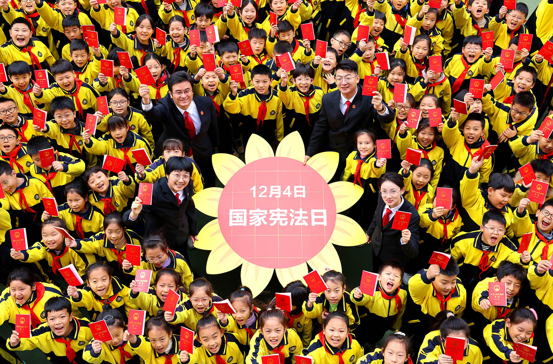12月4日,安徽省含山县司法局普法志愿者在姚庙中心学校向小学生宣讲宪法知识。