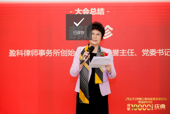 庆典最后,郝惠珍书记为本次庆典总结,她讲到盈科从第1名律师到今天突破10000名律师,既是一个律所的发展史、一个行业的发展史,也是一代人的传承。我们所做的就是要传承律师行业的优秀传统、传承核心价值、传承希望和重托、传承我们的思路和方法。当下,中国律师迎来了前所未有的发展机遇,大家要抓住机遇,实现律师和律所的可持续发展,为中国的法治建设贡献我们的力量。最后她分享了习近平主席说过一句话,“一代人都有每一代人的长征路,每一代人都要走好自己的长征路”,表示无论是前浪、后浪、大浪、小浪,我们在新的征程中都要乘风破浪。
