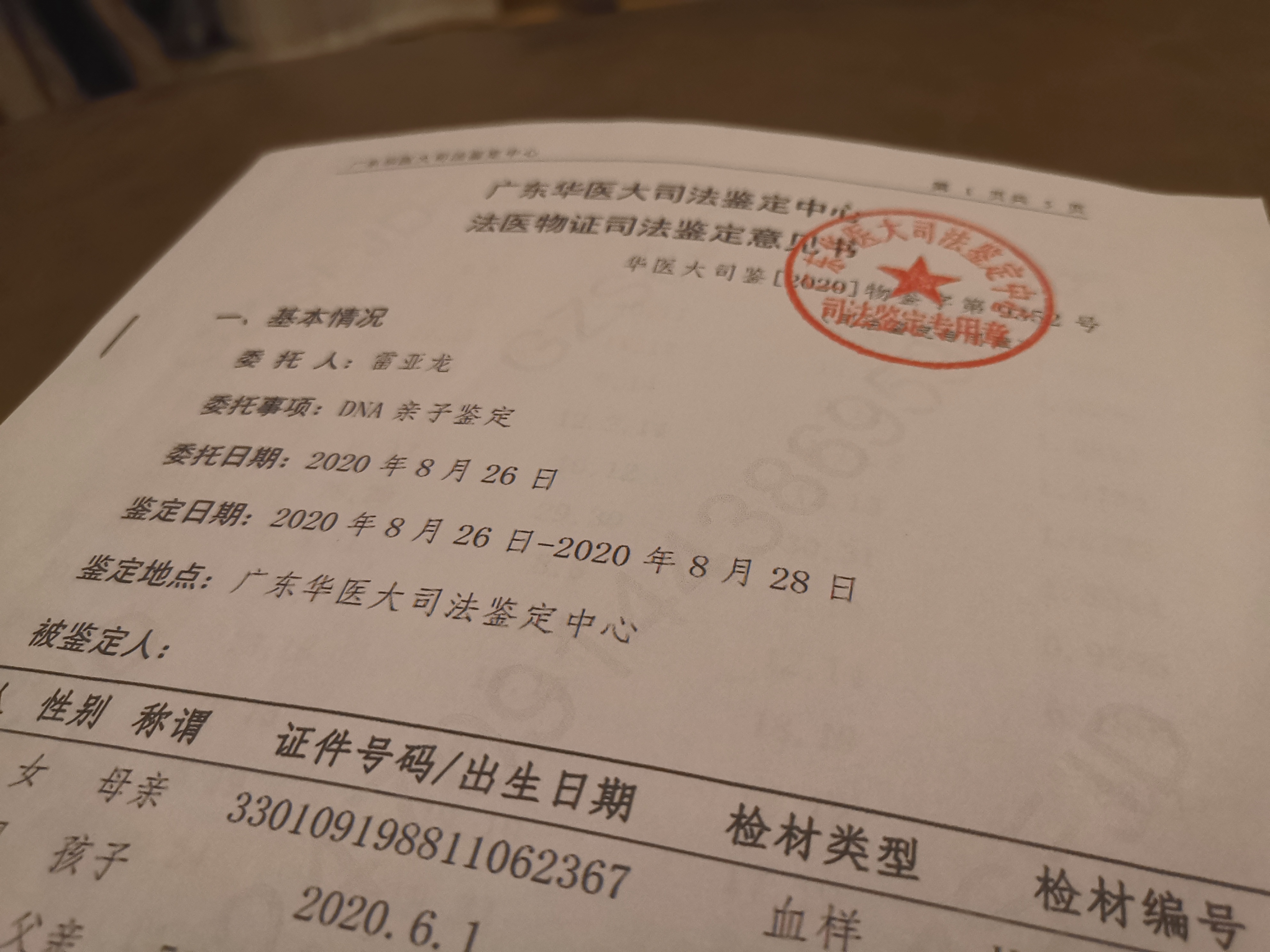 8月29日,“马法医”告知新京报记者,司法亲子鉴定报告已经出了结果,并提供了可用于在官方查询平台“广州公法链”网上查询的“案号”。