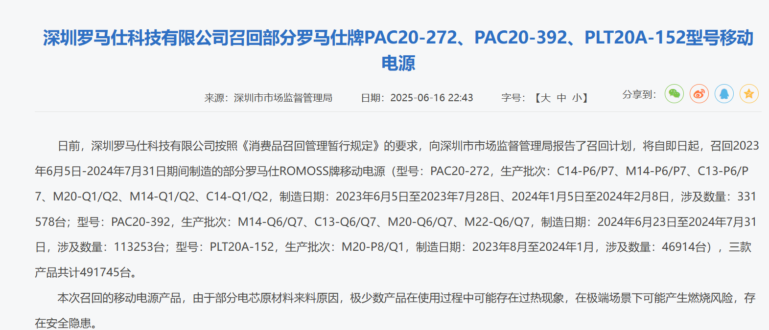 6月16日晚间,深圳市市场监督管理局网站披露,日前,深圳罗马仕科技有限公司按照《消费品召回管理暂行规定》的要求,向深圳市市场监督管理局报告了召回计划,将自即日起召回2023年6月5日—2024年7月31日期间制造的部分罗马仕ROMOSS牌移动电源,三款产品共计491745台。