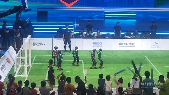 机器人“球员”进球姿势各异,抬“伤员”的担架成“全场最忙”