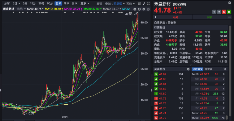 禾盛新材主营业务为家电用外观复合材料(PCM/VCM/PPM)的研发、生产及销售。截至2025年6月30日,公司拥有四条PCM/VCM 生产线、一条智能化复合材料生产线及一条3D打印生产线。公司产品已经覆盖国内外各大知名家电品牌,市场占有率较高。