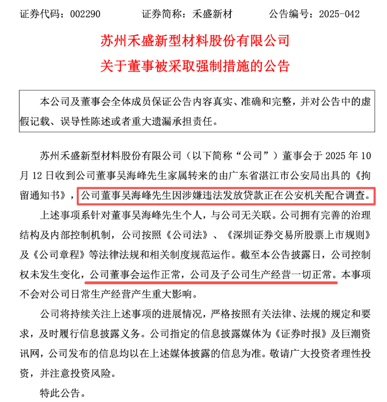 禾盛新材(002290)10月13日晚公告,公司董事吴海峰因涉嫌违法发放贷款正在公安机关配合调查。